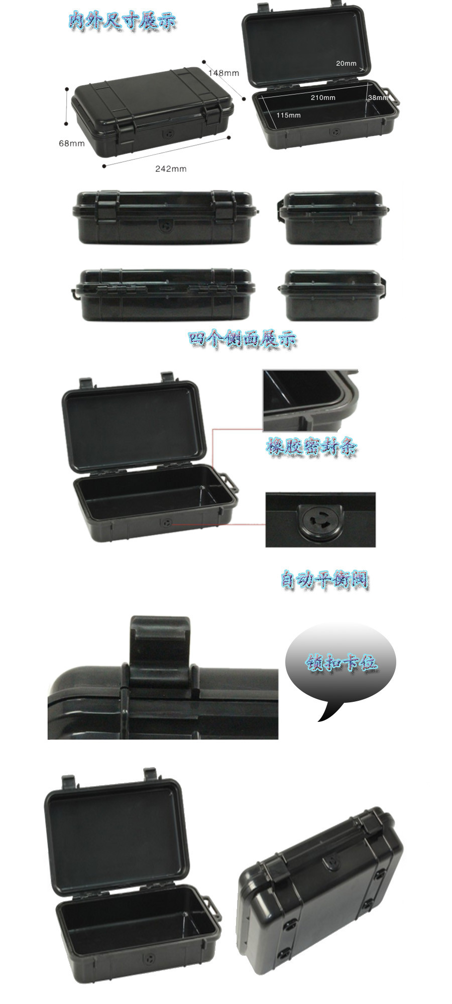 簡(jiǎn)要說(shuō)明:廣泛用于傳媒、公安、消防、軍隊(duì)、航空、戶外攝影、野外考察、科學(xué)探測(cè)等眾多領(lǐng)域的高端儀器、儀表。具有高強(qiáng)度、高抗壓沖擊、防潮、絕對(duì)密封、防塵、防水等特點(diǎn)。產(chǎn)品材質(zhì):ABS原料,箱體采用高抗沖擊的高分子聚合材料一體注塑成型,密封采用扁型彈性發(fā)泡密封橡膠條,確保防水氣密,所有較軸均采用不銹鋼材質(zhì)。