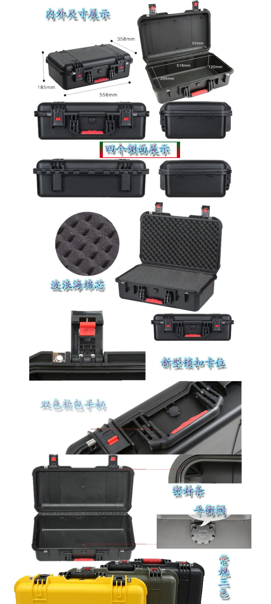 簡要說明:廣泛用于傳媒、公安、消防、軍隊、航空、戶外攝影、野外考察、科學(xué)探測等眾多領(lǐng)域的高端儀器、儀表。具有高強(qiáng)度、高抗壓沖擊、防潮、絕對密封、防塵、防水等特點(diǎn)。產(chǎn)品材質(zhì):ABS原料,箱體采用高抗沖擊的高分子聚合材料一體注塑成型,密封采用扁型彈性發(fā)泡密封橡膠條,確保防水氣密,所有較軸均采用不銹鋼材質(zhì)。