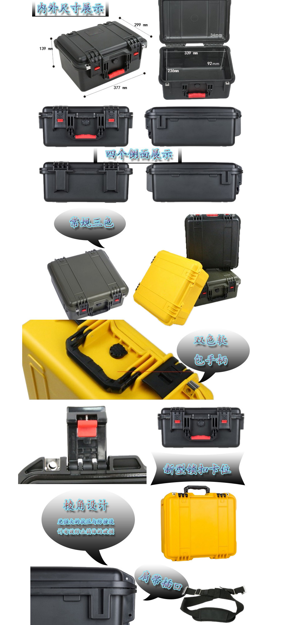 簡要說明:廣泛用于傳媒、公安、消防、軍隊、航空、戶外攝影、野外考察、科學(xué)探測等眾多領(lǐng)域的高端儀器、儀表。具有高強(qiáng)度、高抗壓沖擊、防潮、絕對密封、防塵、防水等特點(diǎn)。產(chǎn)品材質(zhì):ABS原料,箱體采用高抗沖擊的高分子聚合材料一體注塑成型,密封采用扁型彈性發(fā)泡密封橡膠條,確保防水氣密,所有較軸均采用不銹鋼材質(zhì)。